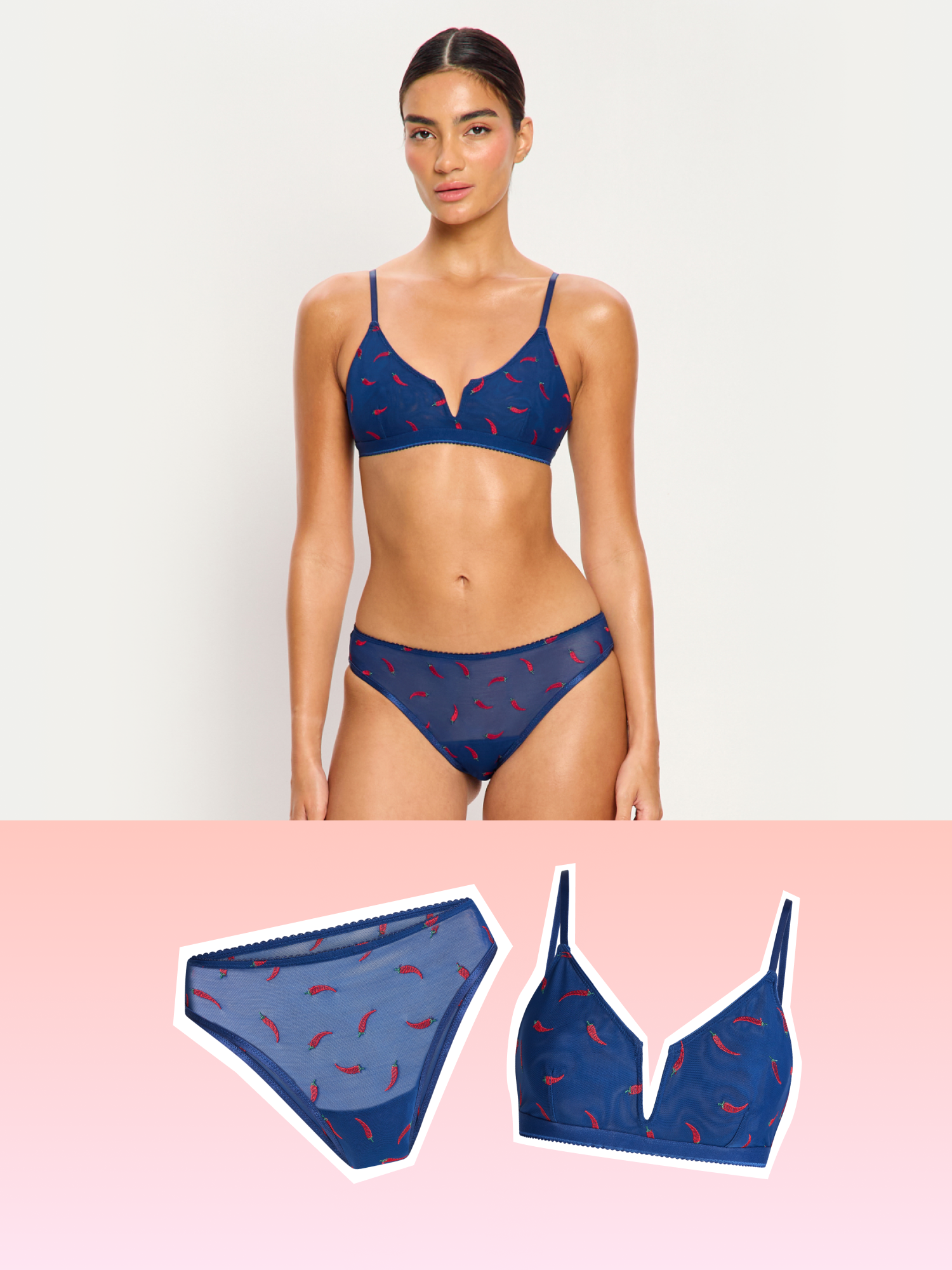 השילוב הכי לוהט במגירה שלך מחכה לך כאן. באנדל ה-Valentine's בגרסת הצ'יקי הוא כל מה שאת צריכה כדי לעבור את הימים הקלילים בסטייל. עם גזרה נמוכה ושובבה שמחמיאה לקימורים ורקמת פלפלוני צ'ילי נועזת, את מקבלת סט הלבשה תחתונה שנראה מדהים ומרגיש אפילו יותר טוב. זה הפתרון האידיאלי לשלב שבו את רוצה הגנה קלילה בלי לוותר על התחושה הסקסית והמשוחררת שלך.