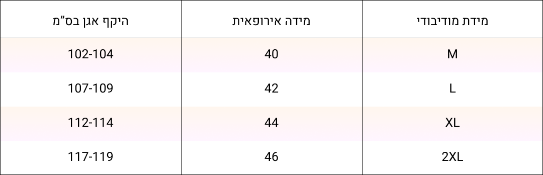 למציאת המידה המדויקת עבורך אנו ממליצות לבחור את המידה הממוצעת בין היקף האגן, מידת המכנסיים ומידת התחתונים שאת לובשת בשגרה.