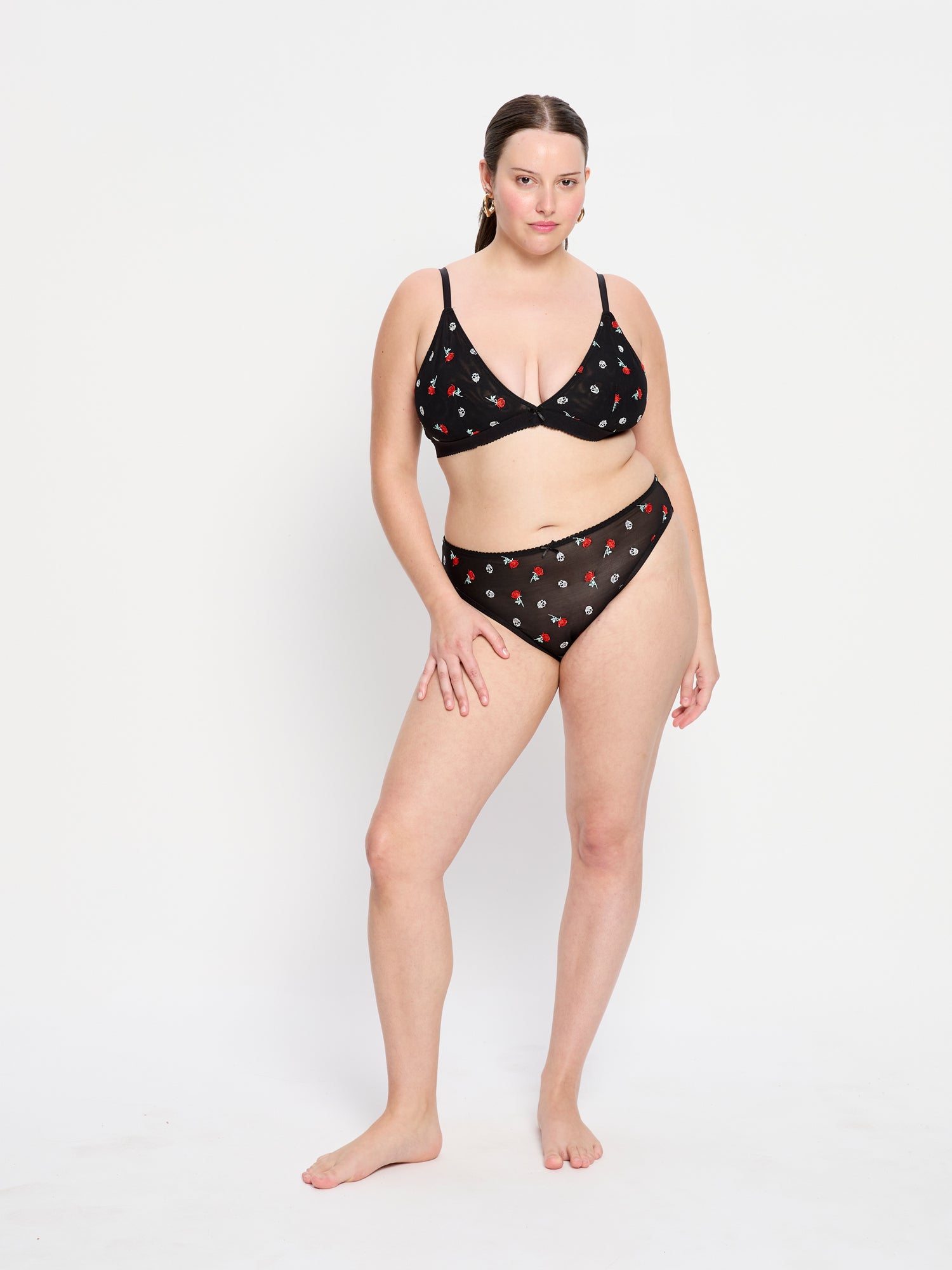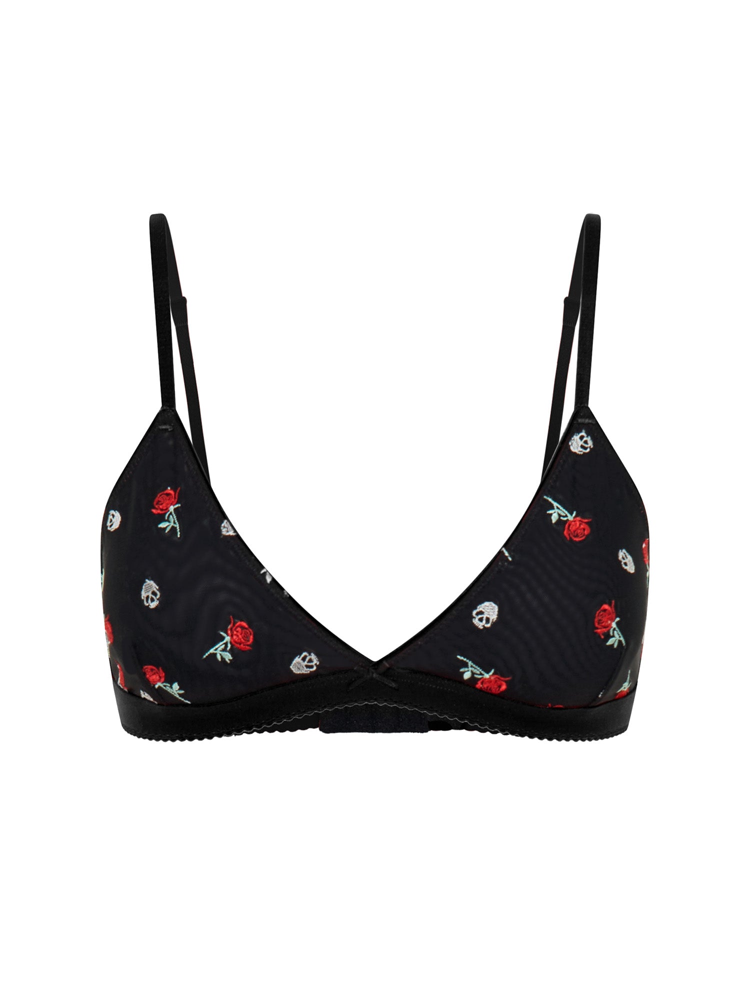 הברלט הזה הוא שילוב משכר של רומנטיקה וחספוס, עם קריצה לעולמות הקעקועים של פעם. הוא עשוי מרשת "פאוור-מש" (Power Mesh) חצי שקופה ונעימה, המעוטרת ברקמת ורדים וגולגולות בהשראת קעקועי רטרו ייחודיים. העיצוב החכם ללא ברזלים מעניק תמיכה טבעית ונוחה, עם קאפים המעצבים מראה עגול ומחשוף V מחמיא. הוא כולל רצועות מתכווננות וסגירה אחורית להתאמה אישית מושלמת, ופפיון סאטן קטן שמוסיף טאץ' פלרטטני לכל הלוק. קל ללבישה, נעים על הגוף ובלתי נשכח למראה.