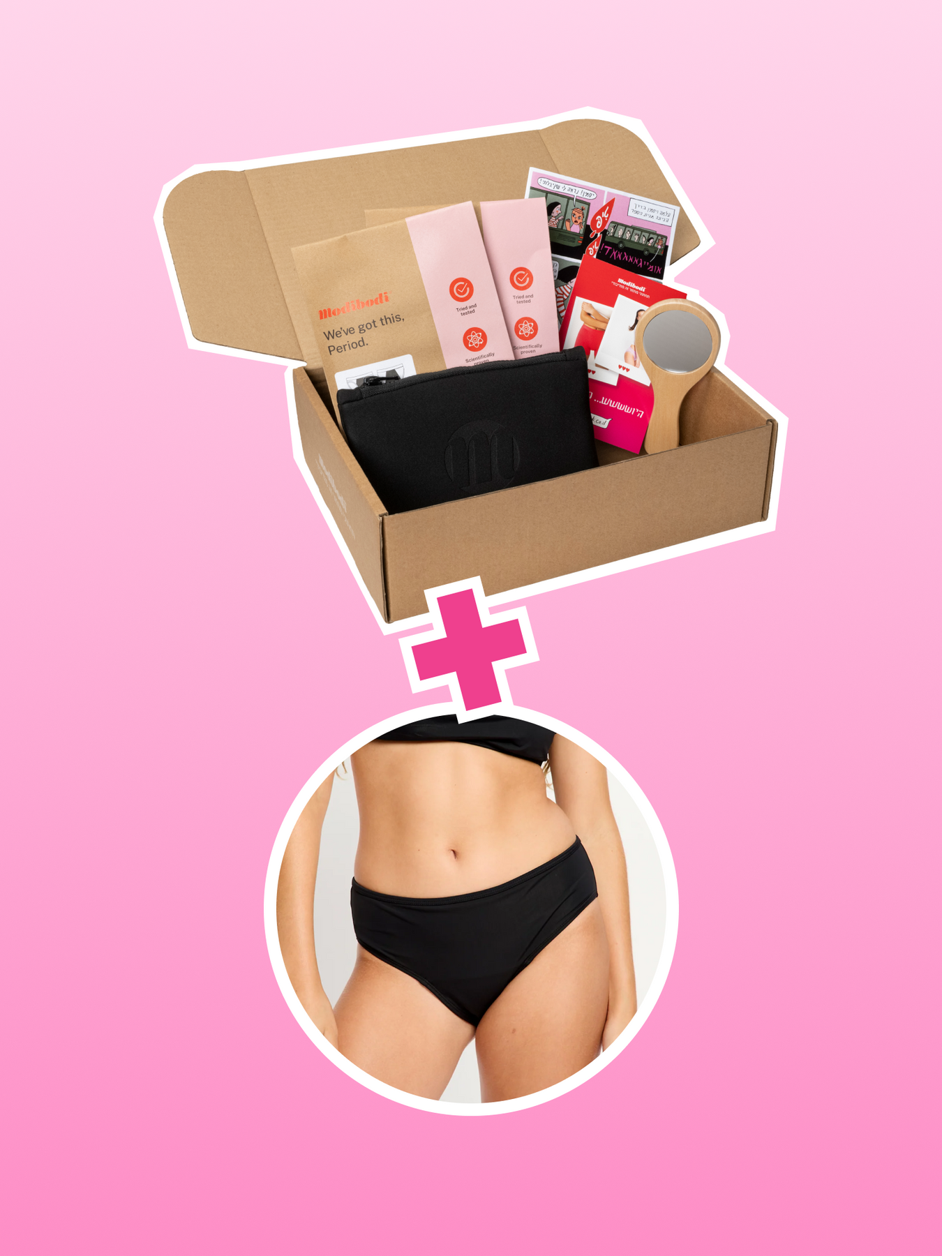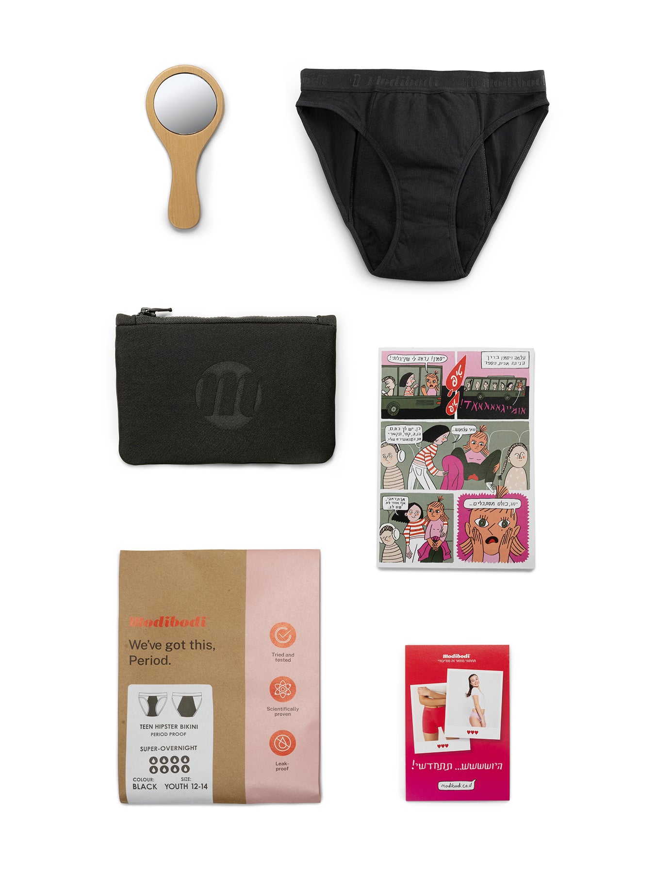 הערכה המושלמת לווסת הראשונה: שני תחתונים סופגים, זוג מכנסי שינה, נרתיק אטום, מראה קומפקטית וקומיקס ידידותי.