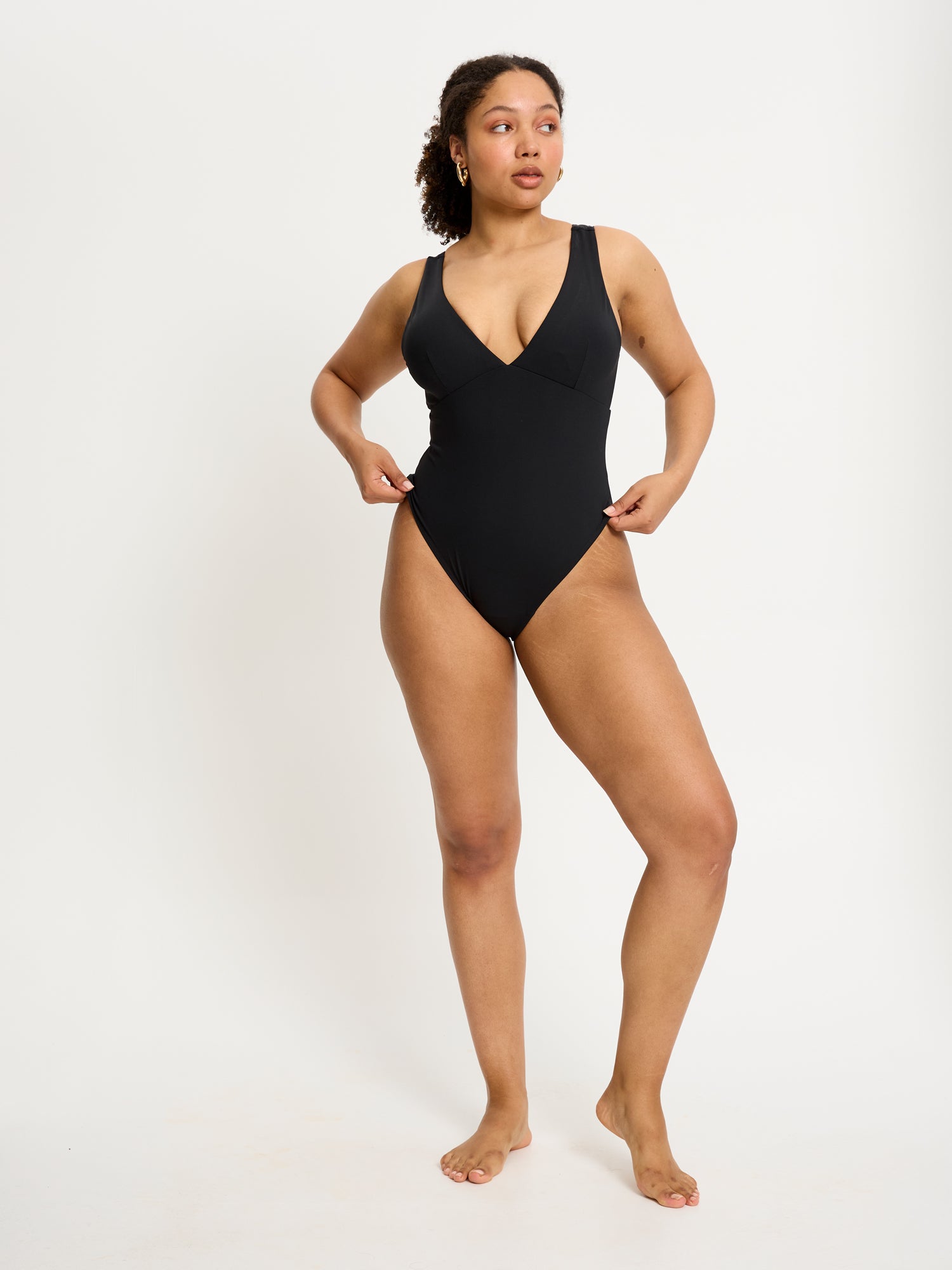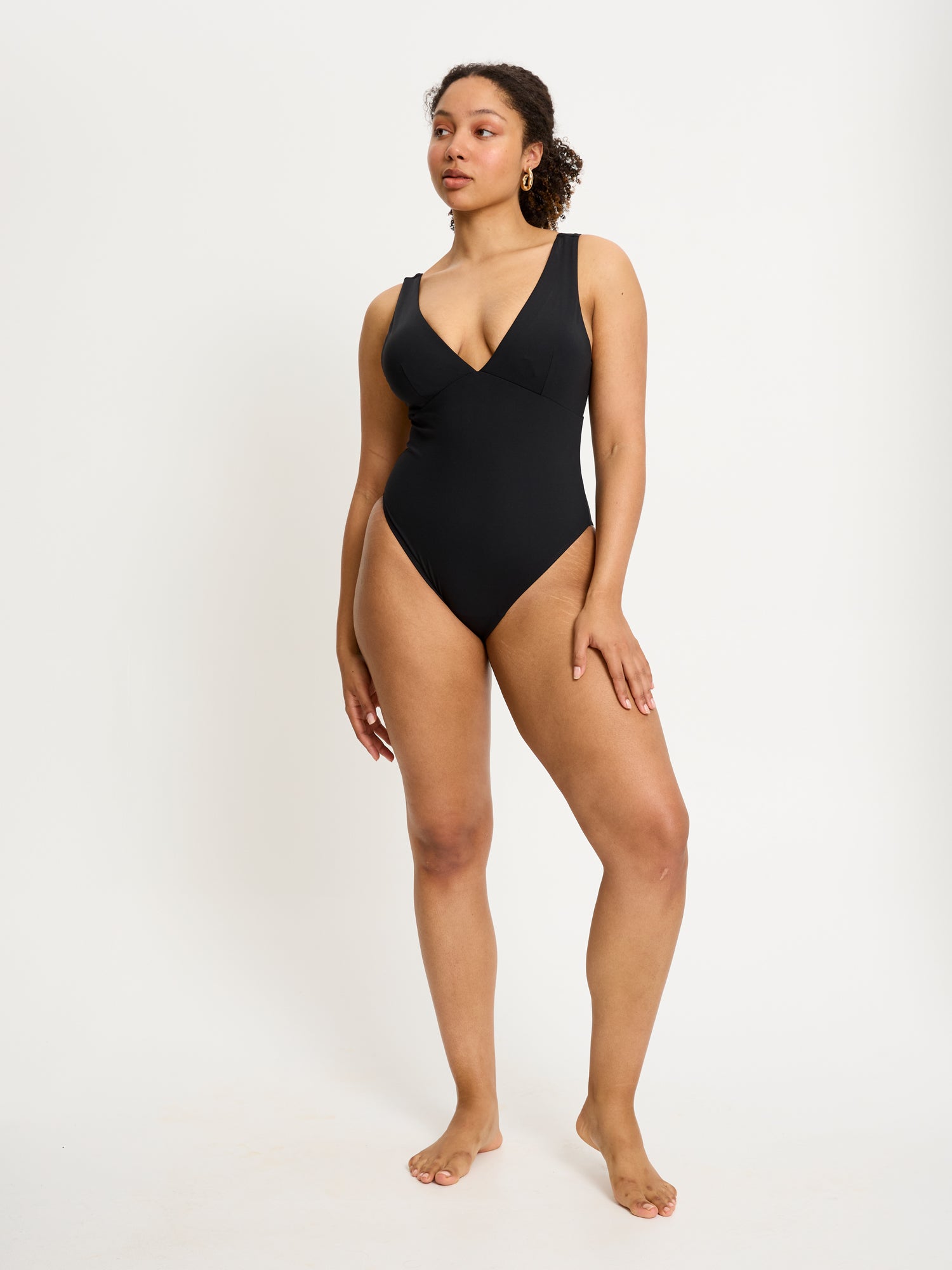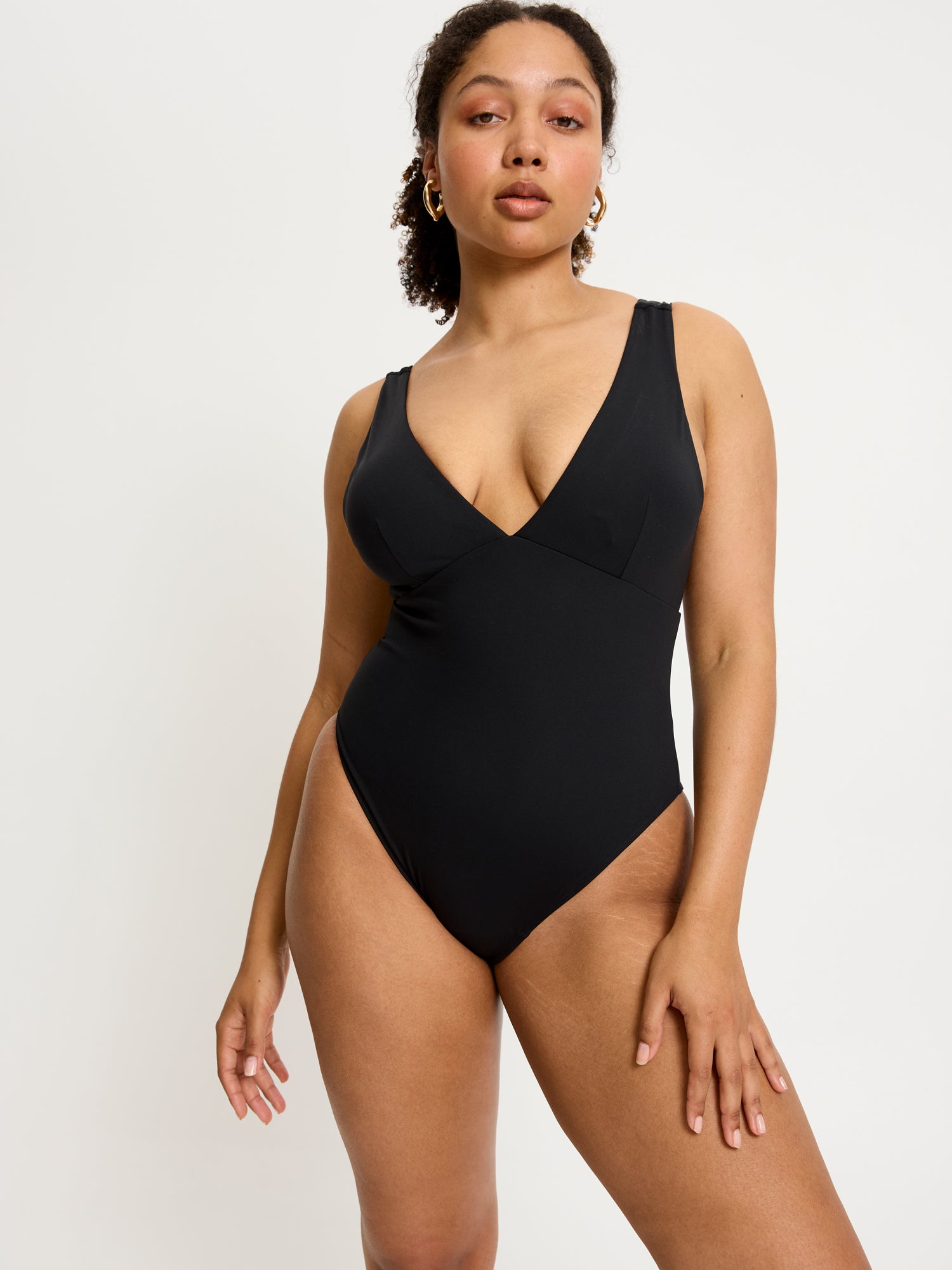 בגד ים שלם בעיצוב קלאסי ומחמיא עם מחשוף וי עמוק.